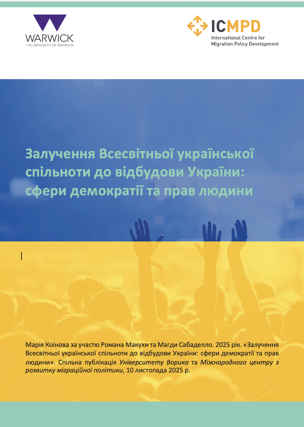 This report establishes a framework for engaging the Global Ukrainian Community (GUC) in Ukraine’s recovery, with a particular focus on promoting democratic participation, protecting human and minority rights, and upholding democratic processes. It builds on insights from a 2023 workshop organised by the University of Warwick and the Office for Democratic Institutions and Human Rights (OSCE-ODIHR), a major 2024 training involving 36 stakeholders conducted by the University of Warwick, OSCE-ODIHR and the International Centre for Migration Policy Development (ICMPD), and additional research in 2025.