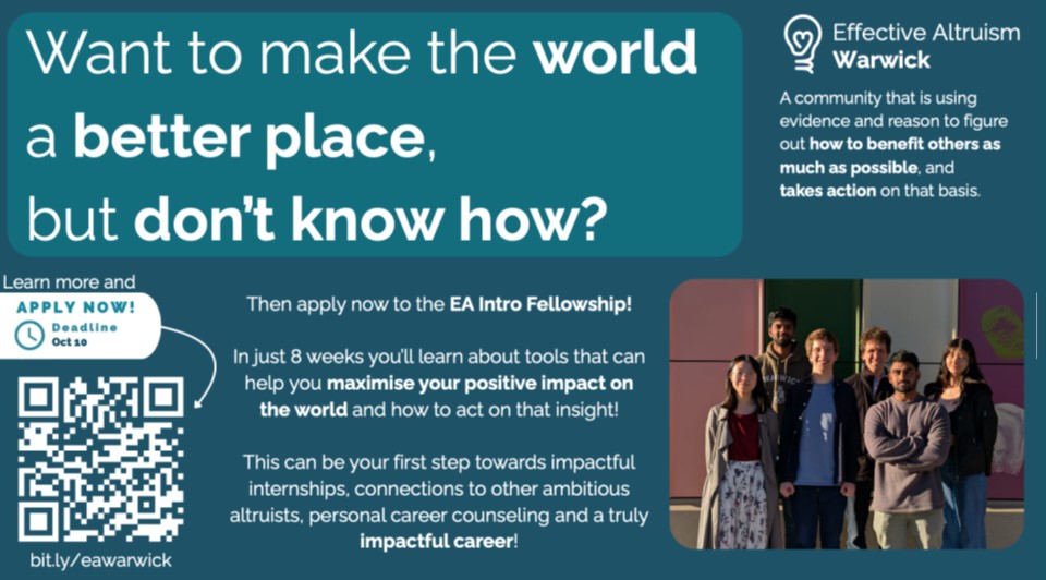 How can we tackle the world's most pressing problems? The Effective Altruism Fellowship helps you to answer this question, and figure out how to do the most good with your live and career – with the ideas of Effective Altruism: a movement and research field of combining evidence, reason and compassion to find the best opportunities for improving the world. As a Politics and International Relations student you are already thinking about global-scale problems and how to solve them through institutions and policy— EA's framework helps you to do it even more effectively by helping with cause prioisation and overcoming biases. The Fellowship is an 8-week program involving weekly readings and small group discussions. Fellows join a campus community of dedicated altruists and gain access to a team supporting your path to impact, including 1-1 coaching and career advice, international conferences and a global network of professionals dedicated to doing as much good as possible. And of course, socials and a fun community to hang out with. Past Warwick EAs moved on to places like MIT, the Open Philanthropy Project, or the UK government to apply what they learned in research, grant-making and policy. Fill out our interest form or apply now at bit.ly/eawarwick