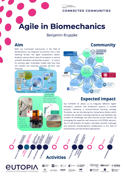 The curriculum includes cooperative problem-solving approaches and agile project management principles. Scrum is learned through practical applications, while biomechanics content is integrated through lectures and instructional videos. Biomechanical projects are tackled in Scrum teams, considering the requirements of stakeholders, including EUTOPIA partners. Throughout the semester, three sprints allow for iterative improvements to a demonstrator, culminating in a prototype presentation and evaluation by stakeholders. Additionally, funding for the project would enable excursions to industrial companies and research centers, enriching the learning experience.