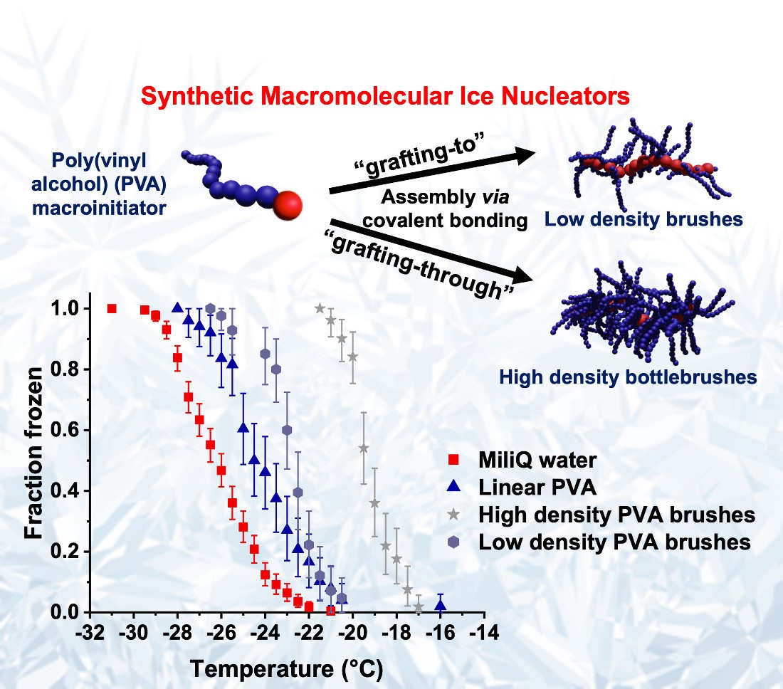The GibsonGroup have a large interest in mimicking the function of ice binding proteins (IBPs) using polymers, which have huge biotechnological, biomedical and industrial potential. The team have previously made progress in mimicking ‘antifreeze’ proteins, but the search for a polymer which can nucleate ice has been elusive. Ice nucleating proteins (INPs) are very large, and truncated versions are far less active, and the native proteins are immobilised in membranes making their study challenging. In this latest work, the team report (what they believe) is the first polymeric ice nucleator. To achieve this they took an ice binding polymer and used synthetic polymer chemistry to make a ‘brush shaped’ polymer to introduce rigidity and very high molecular weight (100’s of kDAs). This new tool is the first synthetically accessible ‘organic’ probe for ice nucleation.
