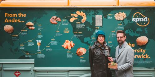 A ready-to-eat Godiva Bean Chilli jacket potato is available from the University of Warwick’s campus SPUD van, launched last year as the first sustainable food offering on campus to move away from ultra-processed foods. The van’s design has been created by University of Warwick food historian, Professor Rebecca Earle – to celebrate the history of the potato and bring it to life.