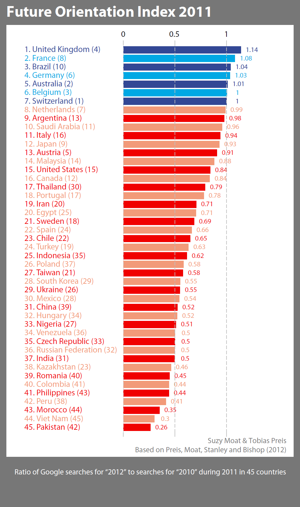 The Future-Orientation Index for 2012 shows Germany as the nation most focused on the future, with Japan second, Switzerland third and the UK fourth. At the bottom of the rankings are Pakistan, Vietnam and Kazakhstan.