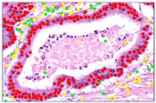 Image: Microscopic landscape of various types of cells - including tumour cells (in red). Click image for high-res.
