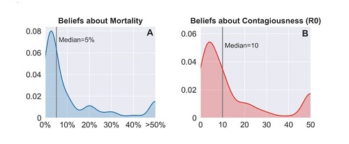 Figure (A) and (B) plot the distribution of beliefs about mortality and contagiousness (R0) of the new coronavirus as measured in a representative sample (N=915) of the US population on March 4th 2020.