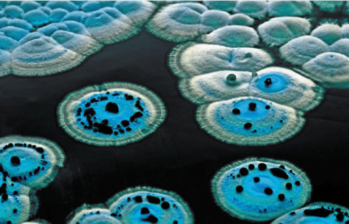 - A panoramic view of Streptomyces coelicolor including the blue antibiotic actinorhodin is excreted into the medium and into aqueous droplets on the hydrophobic surface of the colony. Credit: Selim, Manal S. & Abdelhamid, Sayeda & Mohamed, Sahar. (2021). Secondary metabolites and biodiversity of actinomycetes. Journal of Genetic Engineering and Biotechnology. 19. 10.1186/s43141-021-00156-9.