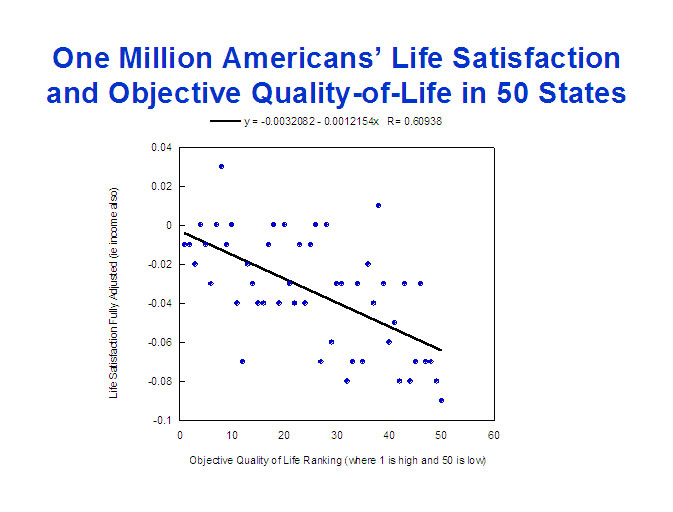 “The state-by-state pattern is of interest in itself. But it also matters scientifically. We wanted to study whether people's feelings of satisfaction with their own lives are reliable, that is, whether they match up to reality -- of sunshine hours, congestion, air quality, etc -- in their own state. And they do match. When human beings give you an answer on a numerical scale about how satisfied they are with their lives, you should pay attention.