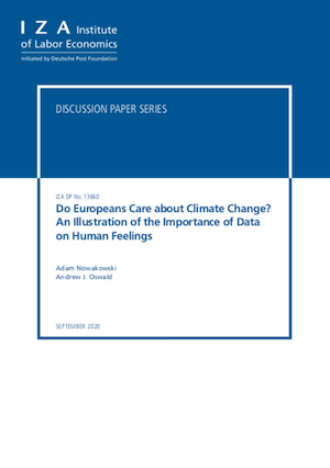 - Do Europeans Care about Climate Change? An Illustration of the Importance of Data on Human Feelings. Adam Nowakowski, Bocconi University and Andrew J. Oswald, University of Warwick, CAGE and IZA. IZA Discussion Paper No. 13660