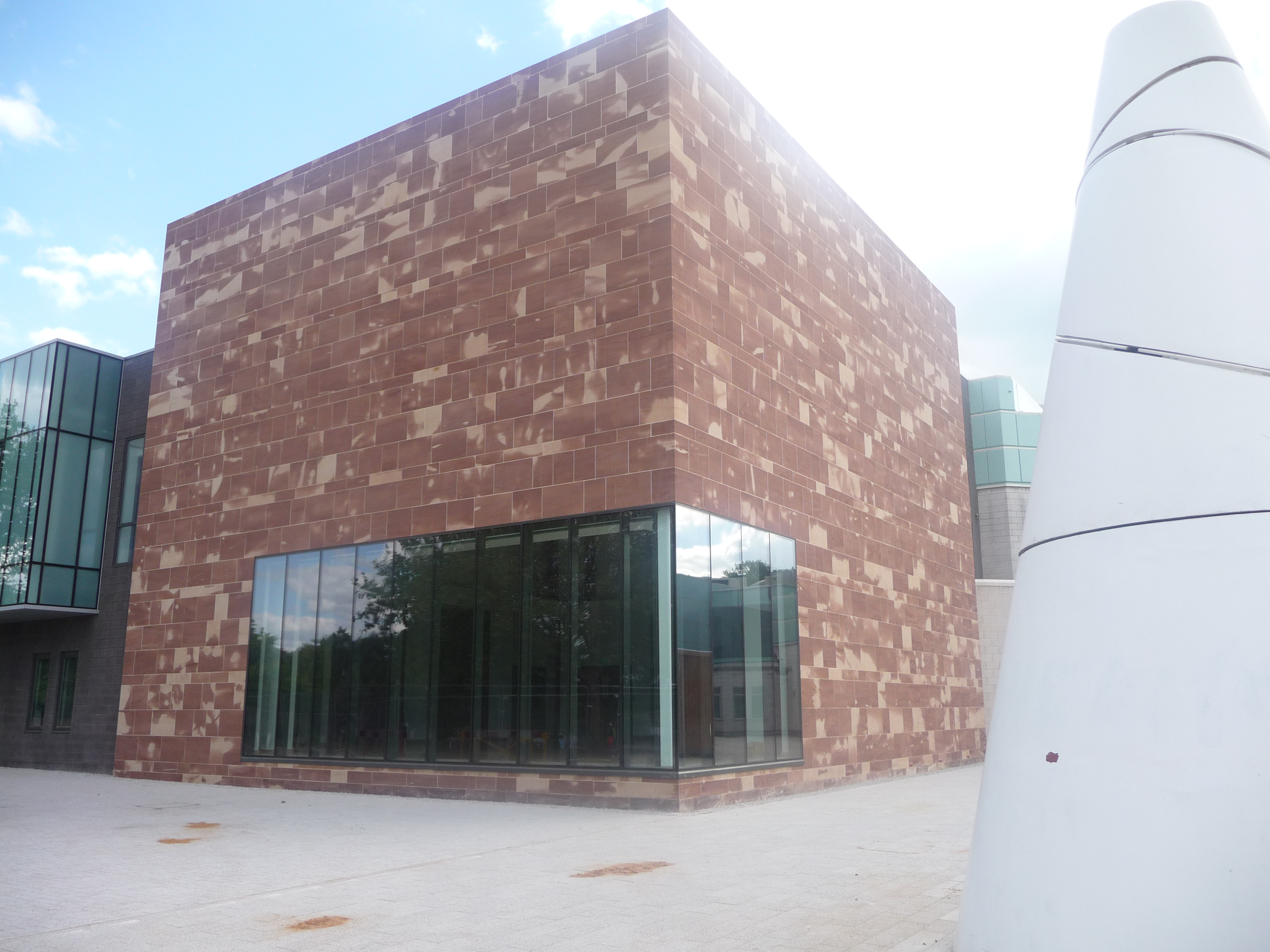 The new Helen Martin Studio is built in a prominent position next to the Arts Centre’s main entrance and is clad in distinctive local red sandstone. It provides a well lit flexible environment for a huge range of creative activities and is already being used extensively by visiting artists, producing companies and local school children and young people as well as for student music and drama rehearsals.