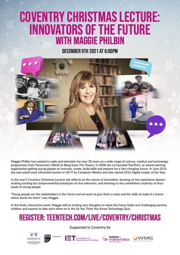Listen to Maggie Philbin, Co Founder of charity TeenTech, hosting an insightful and innovative Christmas Lecture that took place on 9th December 2021.