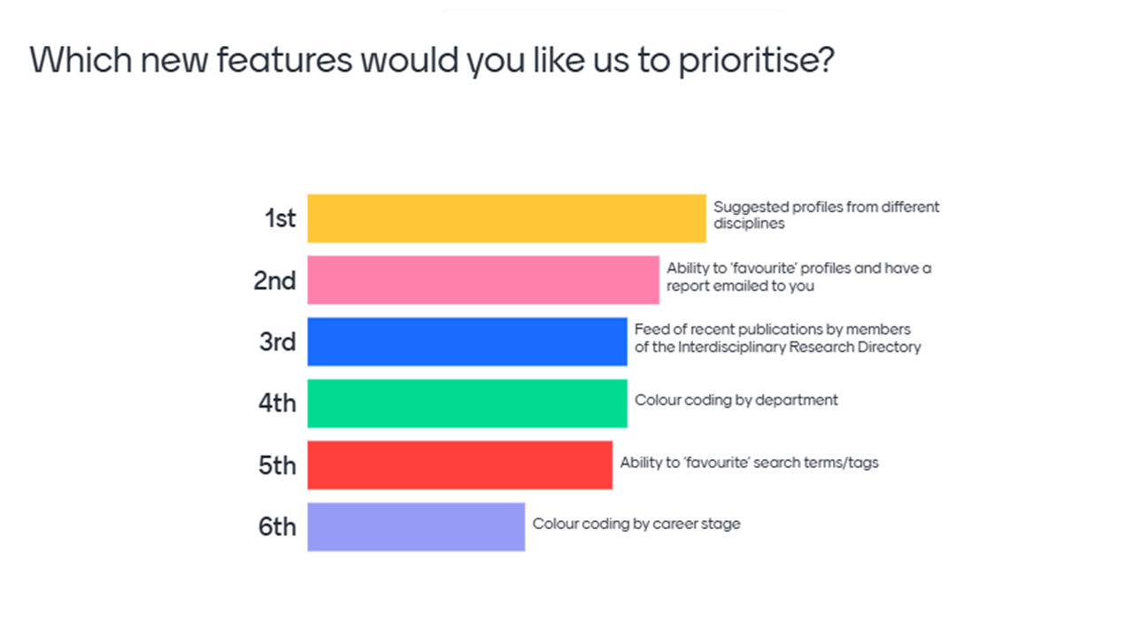 1. Suggested profiles from other disciplines; 2. Ability to favourite profiles and have a report sent to you; 3. Feed of recent publications; 4. Colour coding by department; 5. Ability to favourite search terms; 6. Colour coding by career stage