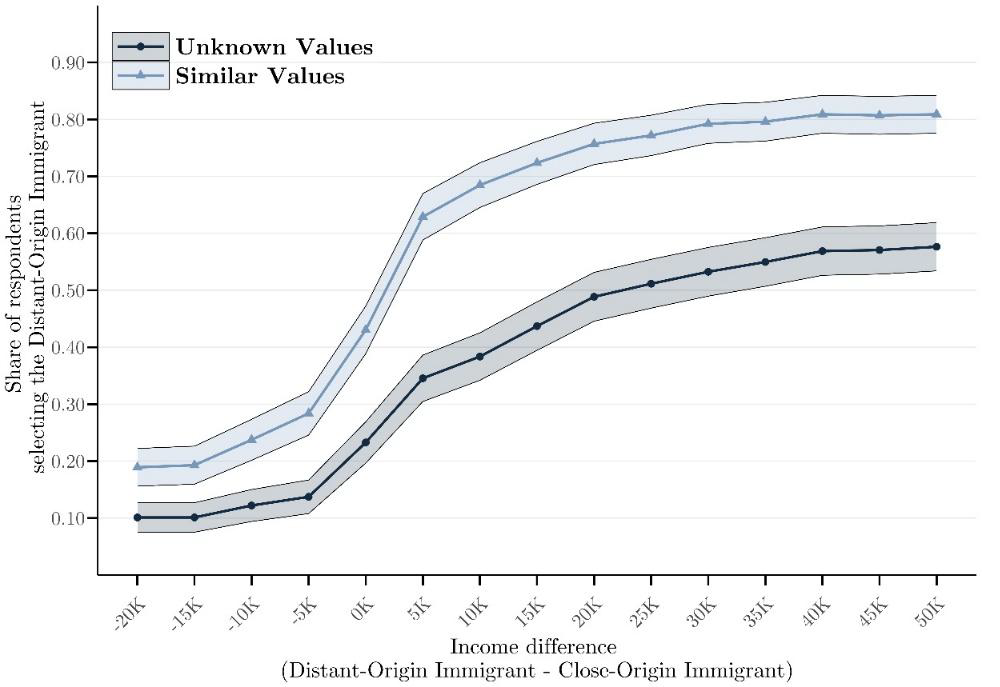 Notes: When deciding which immigrant should stay in the UK, a larger income gap between an immigrant from a culturally distant country of origin and one from a culturally similar origin with similar values increases the likelihood that natives choose the distant-origin immigrant. However, when the distant-origin immigrant’s individual values are unknown, around 40% of respondents never choose him — even when he earns over £50,000 more than the close-origin immigrant. Providing information that the distant-origin immigrant holds values similar to those in the UK increases the share of respondents who choose him at every income level.