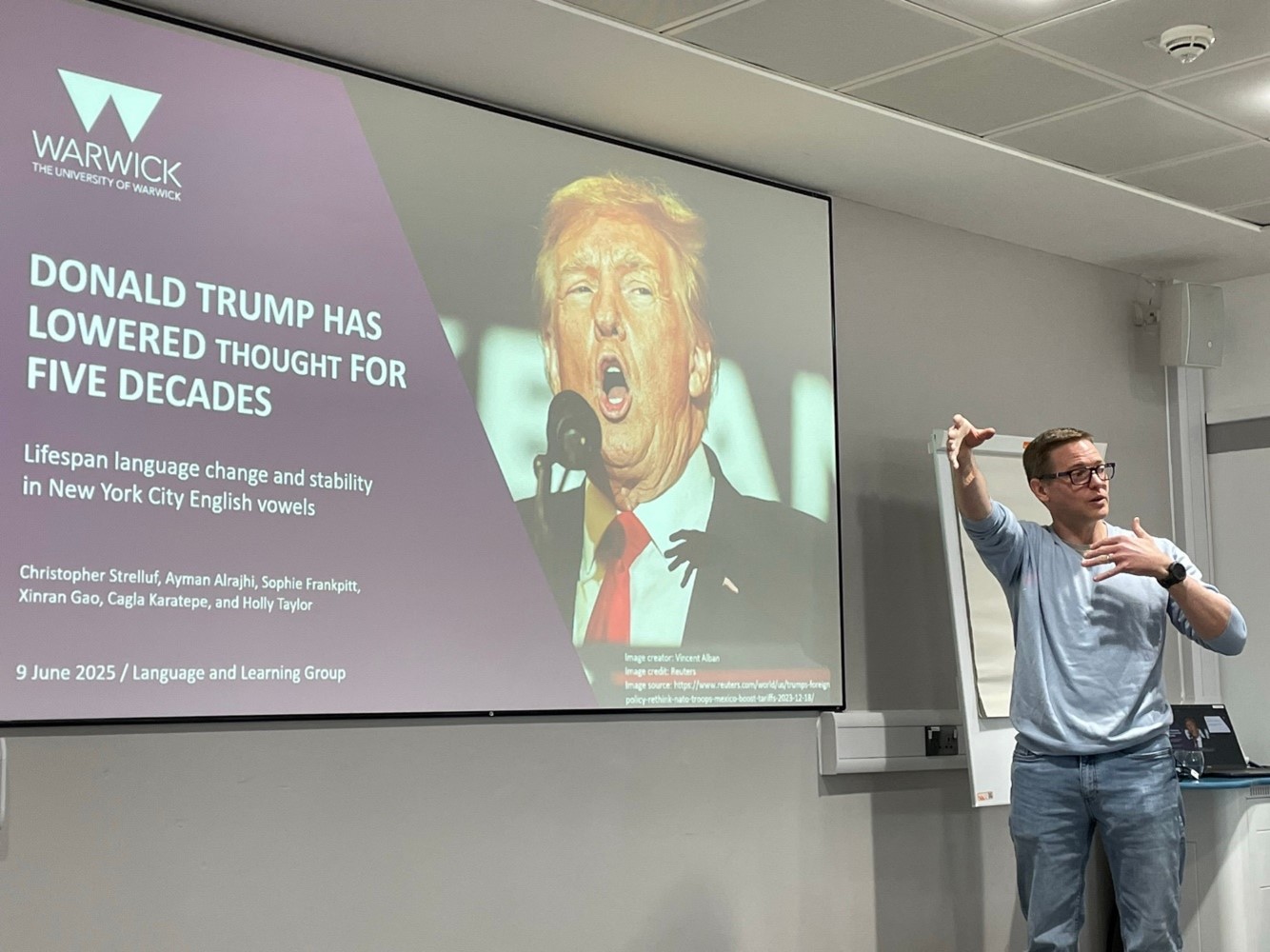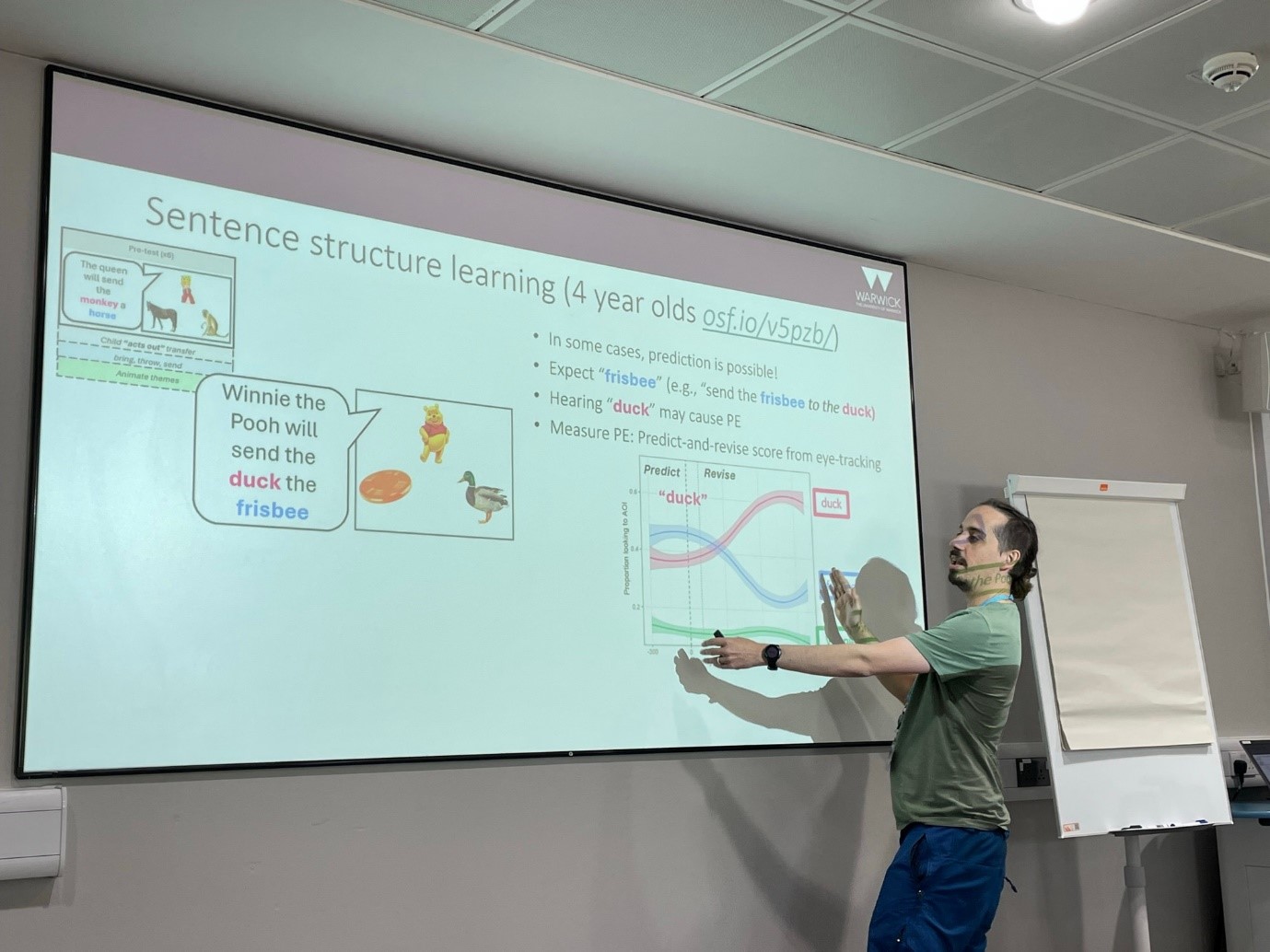 We have organised this event on campus in Radcliffe space 12, on Monday the 9th of June 2025, from 9am – 5pm. The event brought together researchers at the University of Warwick, working on the topic of Language. The event counted 34 participants, with participants from 6 different Warwick Departments, including Psychology, Applied Linguistics, Philosophy, Warwick Business School, Italian Studies, and Computer Science. Among the participants, there were 18 postgraduates and 16 staff. Among the participants, there were 20 females and 14 males. Furthermore, the speaker programme included 11 postgraduates, 5 academic staff members, and an invited talk from Research & Impact Services (RIS) about large centre grant applications, focusing on the upcoming centre grant call of the ESRC in 2026. We ended the day with generating ideas for new research, in small groups, which could become part of the large ESRC centre grant application.