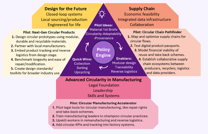 At its core, the framework is structured around Seven Strategic Priorities, operationalised through the Circular Manufacturing Policy Engine, enabled by Systemic Enablers, and translated into practice via the Circular Manufacturing Toolkit. Together, these components form a coordinated delivery ecosystem designed to: