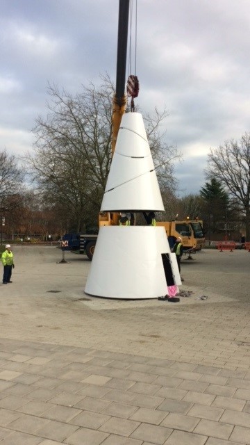 The Iconic sculpture White Koan by Liliane Lijn has returned to its original home outside Warwick Arts Centre. It was installed by the Clinical Trials Unit on the Gibbet Hill campus whilst work continued on the Arts Centre refurbishment and has now returned. Before it's arrival it was treated to a full make over with our conservator overseeing its shot-blasting, filling and repainting. It is now back in tip top condition and we hope you will agree it is looking great! The electrics and neon will be going in over the next few weeks. We hope you will come and visit it. To find out more about Liliane Lijn and White Koan we have lots of information on our artist page.
