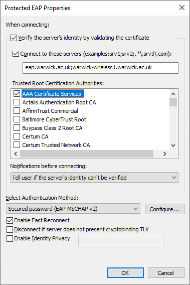 - Connect to these servers: eap.warwick.ac.uk;warwick-wireless1.warwick.ac.uk