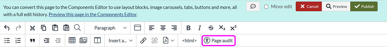 As a public institution, the University has a legal obligation to make its web content accessible. SiteBuilder offers tools in both the Components Editor and the old visual editor that help you check the accessibility of your content.