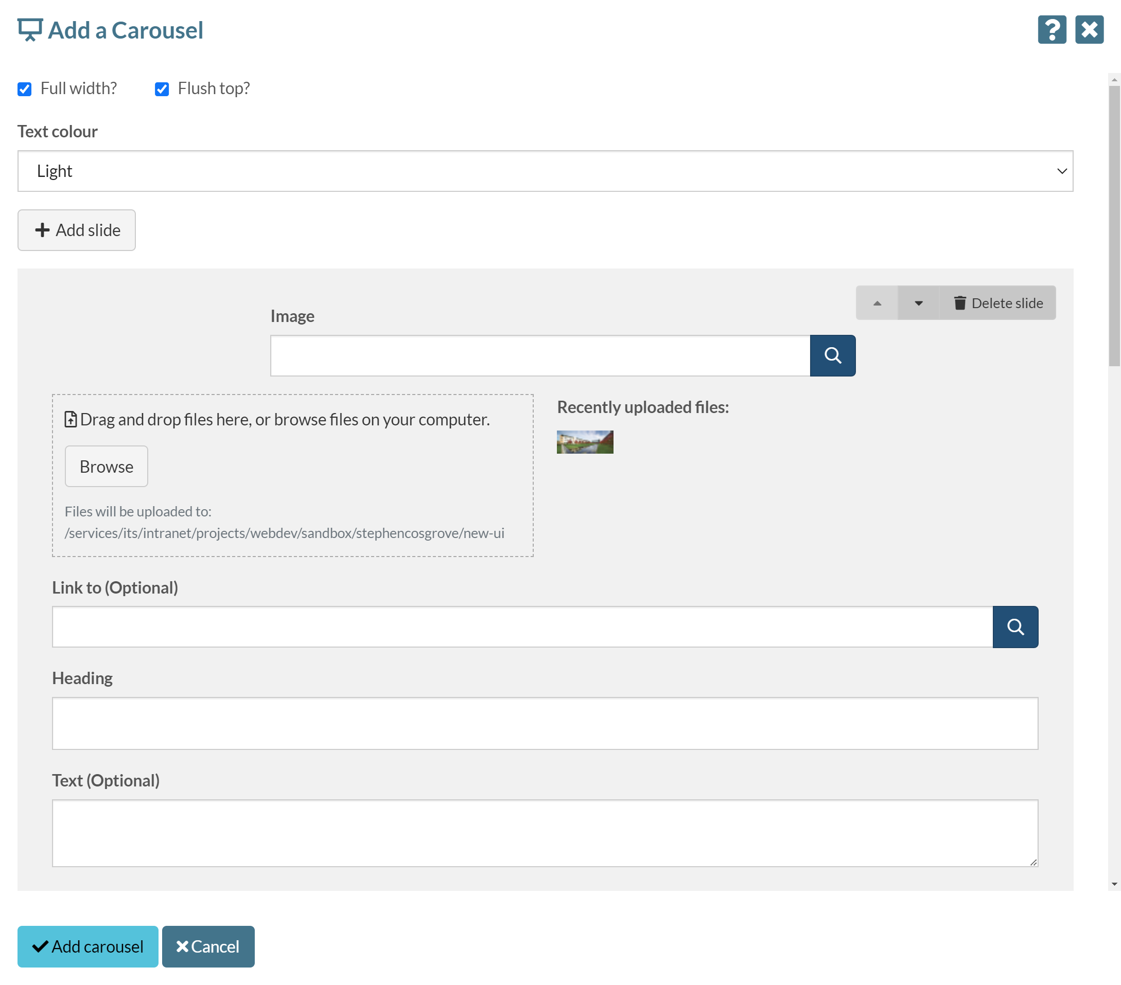 To add another slide, select the Add slide button. There is one of these buttons at the top and bottom of the pop-up, to add slides at either end of the carousel.