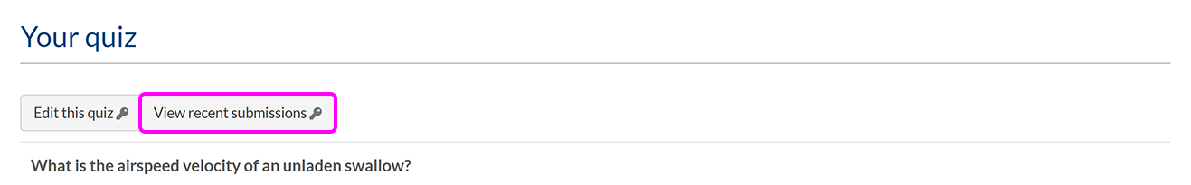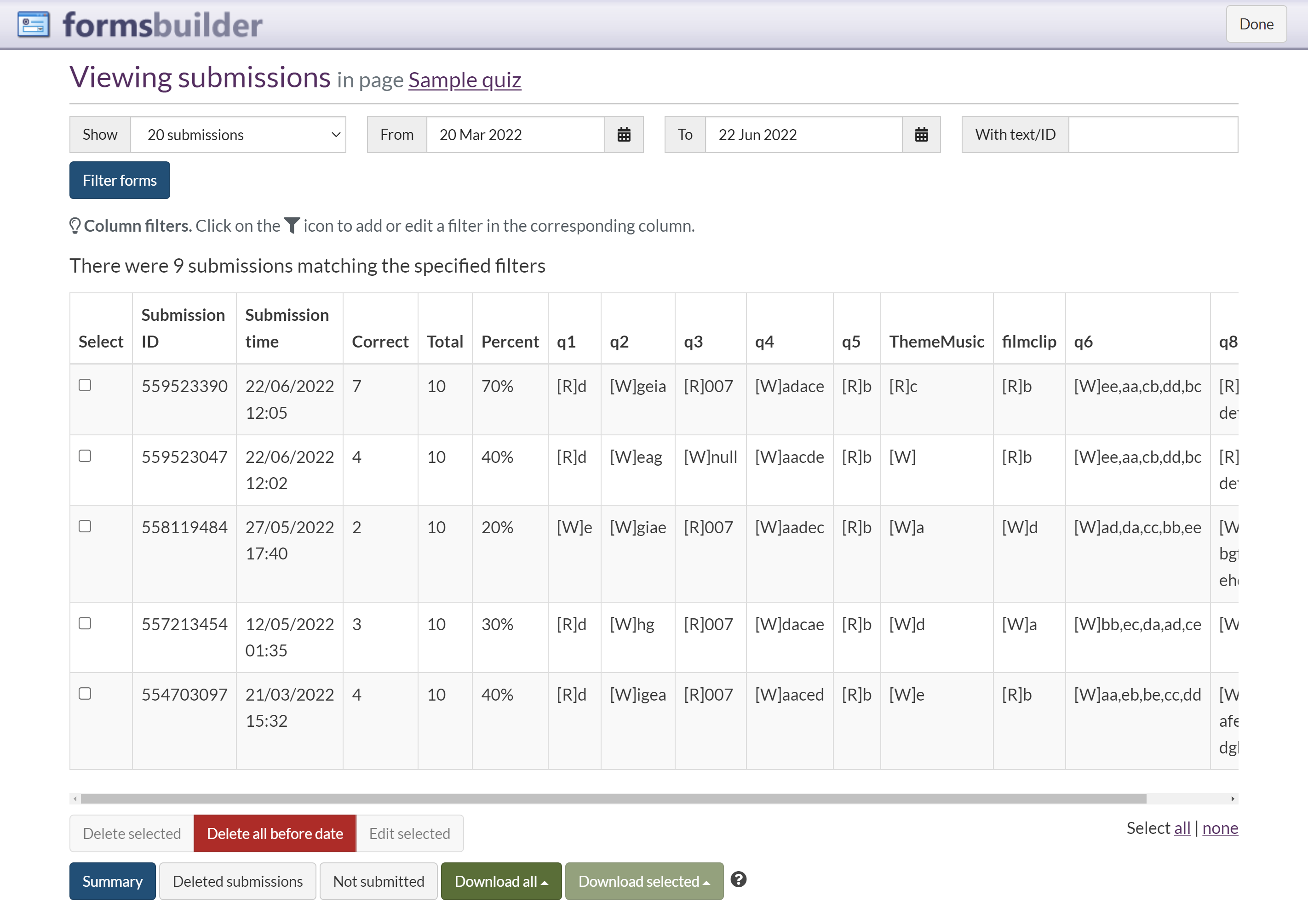 To view and download quiz submissions you must have either permission to view quiz submissions, or edit or admin permissions for the quiz page.