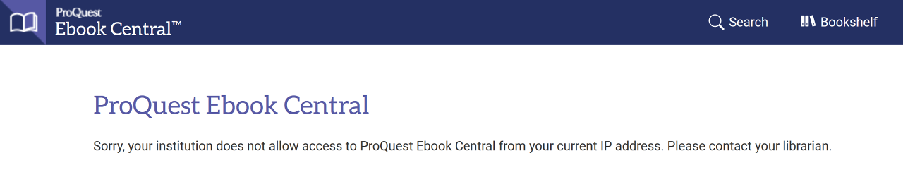 Access to ProQuest Ebook Central has been working intermittently since Friday 16th January, with some users reporting no access due to their IP range.