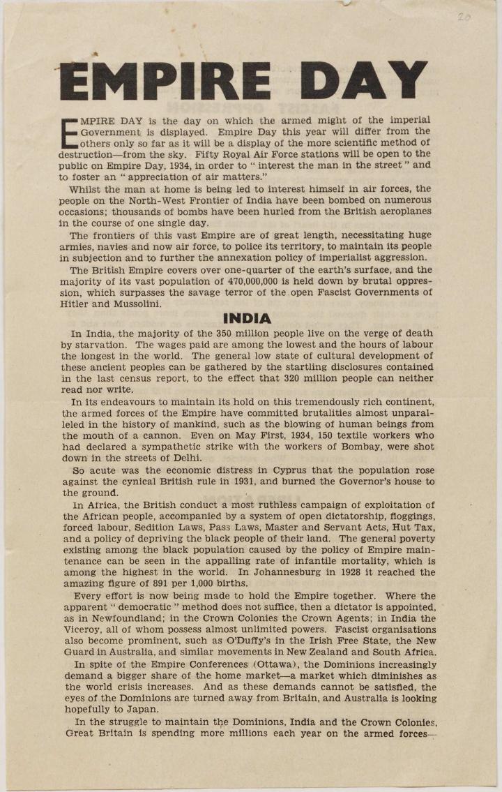 My research started with a piece titled ‘Empire Day’, (Document Reference Number: MSS.292/778.22/6/1) in which the author expresses their concerns of how the British Empire treats the countries under its rule. And rightfully so, as it not only states that “the majority of 350 million people live on the verge of death by starvation in India” but that the hours of labour were the longest in the world with a subsequent wage which was also amongst the lowest. Being of Indian ethnicity myself, I was already partially aware of what the Empire had done to my country such as the taking of resources (e.g. gold), however I had failed to consider how far the abuse went.
