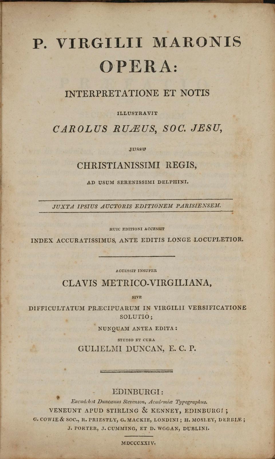 For all its promises of correcting issues in the index, in actuality it added to them - and much like Stevenson’s previous foray into libellous newspapering, the illusion of authenticity unwinds near the end. In 1843, there is another “second” edition print of Virgil’s entire works that looks to be based on the 1824 edition (P. Vergilii Maronis opera : interpretatione et notis illustravit Carolus Ruaeus ; jussu christianissimi regis, ad usum serenissimi Delphini ; juxta ipsius auctoris editionem parisiensem ; huic editioni accessit index accuratissimus, ante editis longe locupletior ; accessit insuper clavis metricovirgiliana, sive difficultatum praecipuarum in Virgilii versificatione solutio ; nunquam antea edita, studio et cura Gulielmi Duncan : Virgil : Free Download, Borrow, and Streaming : Internet Archive), now printed by Oliver & Boyd. Its metrical key is not split between the start and the end, and it puts its editorial preface at the beginning. The change in printers appears to indicate the confidence that Edinburgh University Press had in Stevenson’s 1824 print.