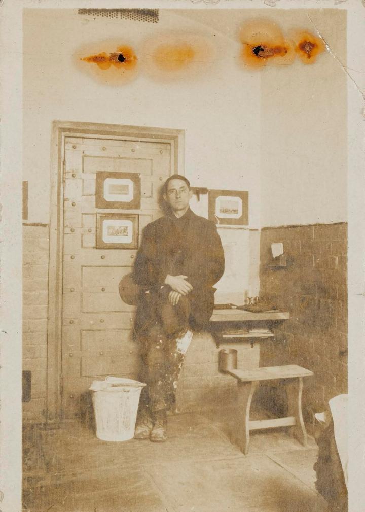 |   Rachel MacGregor, Digital Preservation Officer at the MRC, shares her recent discovery of the papers of Rowland Barrett and their varied and striking contents. I came across the papers of Rowland Barrett whilst preparing a social media post to commemorate International Conscientious Objectors Day and was first of all intrigued that so little was known about this fascinating, if (possibly reading between the lines here) slightly eccentric man, who in the catalogue entry we have for him is described as “socialist, upholsterer and journalist”, occupations for which socialism was lifelong and upholstering and journalism he dipped in and out of, as well as campaigning on a very wide number of issues, vegetarianism and running a small holding and holiday camp. What little information we have on him is drawn from an article written by a former archivist at the Modern Records Centre and it would be wonderful if someone had the chance to do a bit more digging and reconstruct this. The collection of his papers represents the most dangerous kind of rabbit warren that an archivist is likely to face – subjects as varied as spelling reform, furniture history, bee keeping and numerous dabblings in local politics, including getting arrested on a charge of obstruction for holding Independent Labour Party meetings in Nuneaton marketplace. However as I mentioned my particular interest was caught by this startling image of him, standing in his prison cell in Wakefield, where he had been imprisoned for being a conscientious objector during World War One. Photograph of Barrett in his cell, 15 Oct 1917 Document Reference: MSS.83/3/PR/17 We can make out his “Home Office clothes” as he describes it on the reverse of the photograph and his fixed stare at the camera. The original of the photograph measures only a few centimetres across so it was only when we digitised and could zoom in on the detail that we could make out all the details of the candlestick in the room and the prints on the wall. It also took me quite a while to realise that the bucket at his feet was not, in fact, his cell “facilities” but is a bucket of whitewash, which he has also liberally coated his “Home Office” trousers in. In fact this is specifically referred to in a humorous poem which Barrett apparently wrote (and was recited by one Lindsay) which can be read in its entirety here but includes the lines: “How did I get these views sir? 'Twas when we were gay young sparks, That someone lent me a book, sir; A book by the great Karl Marx.