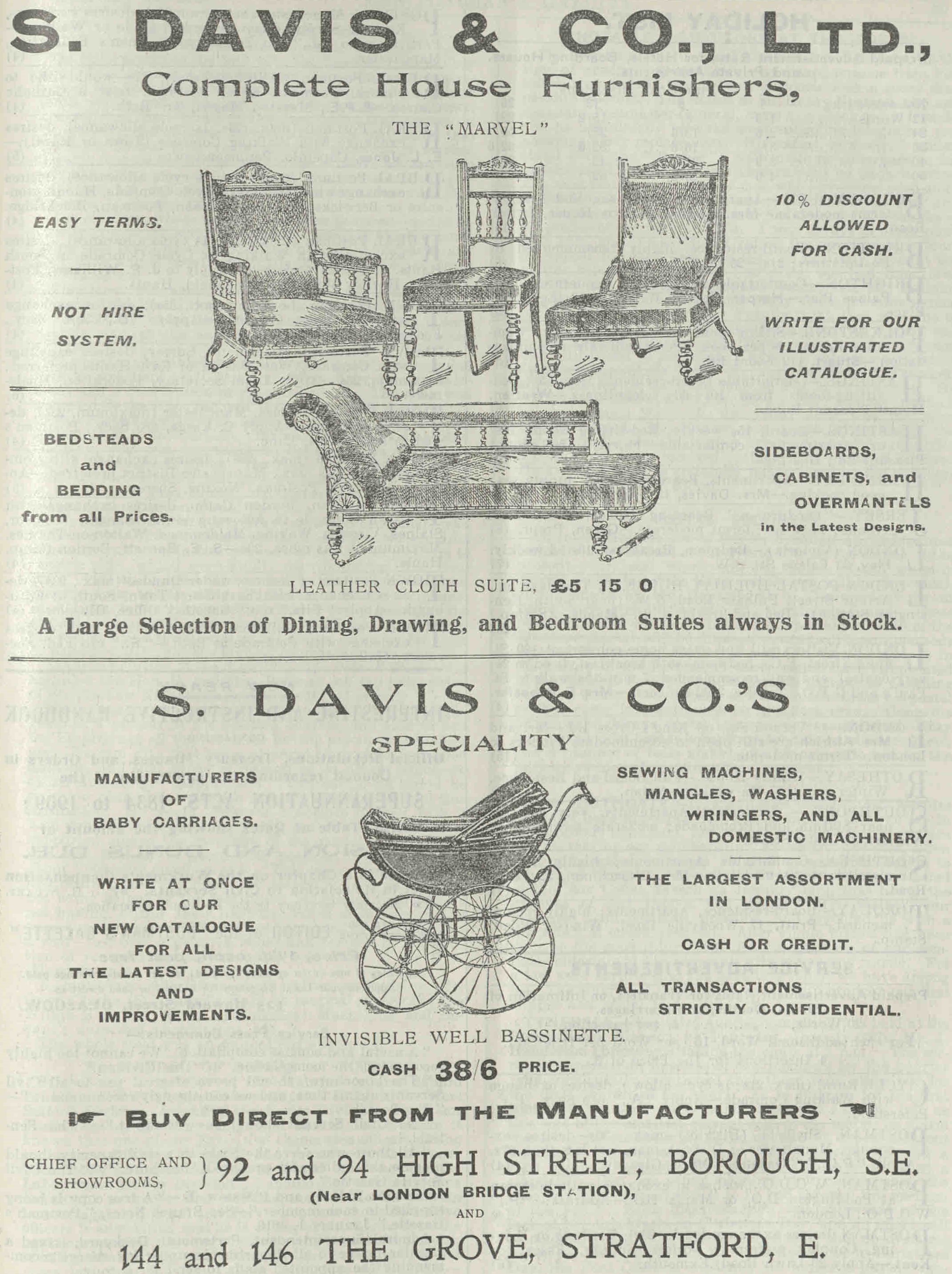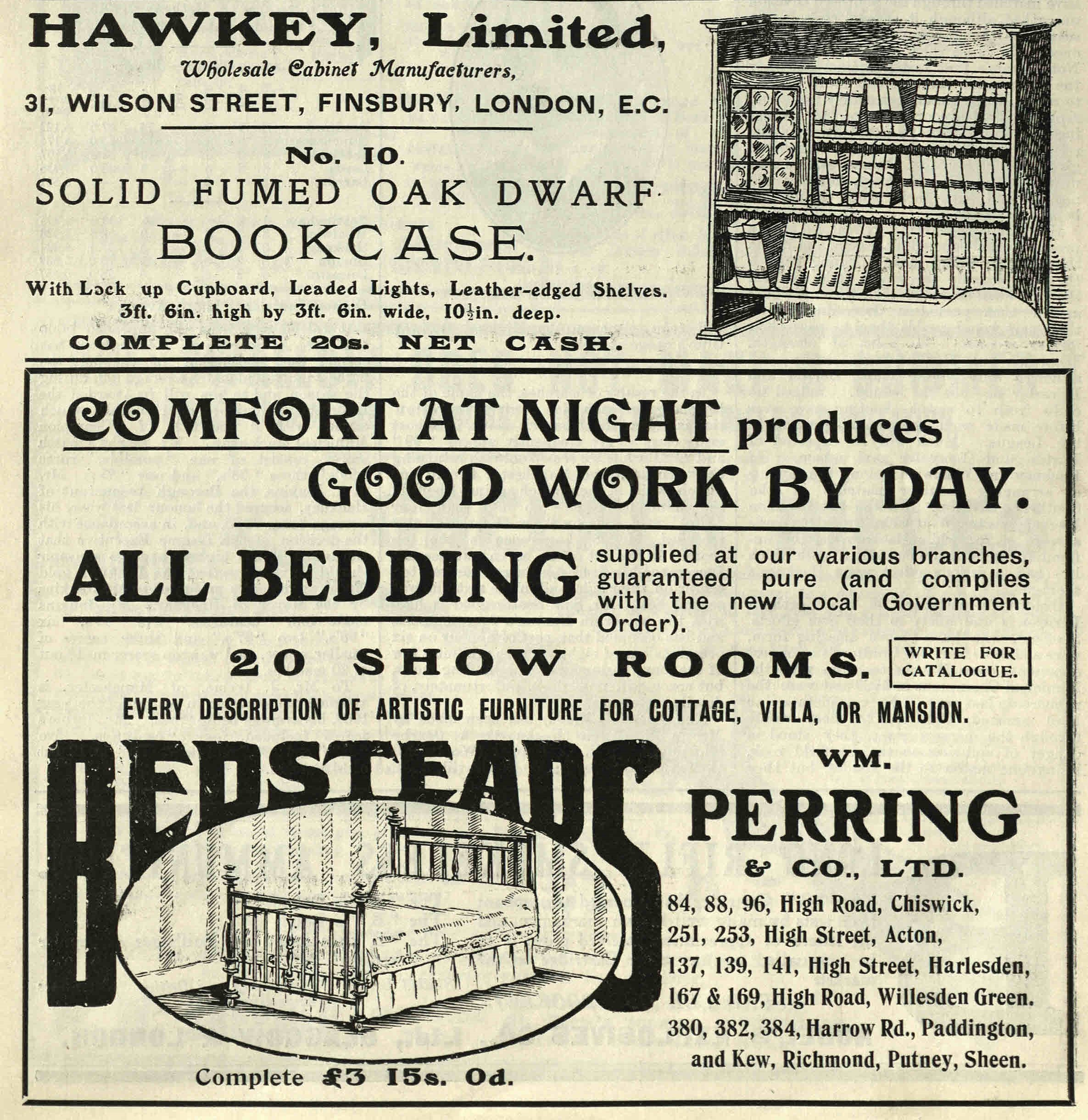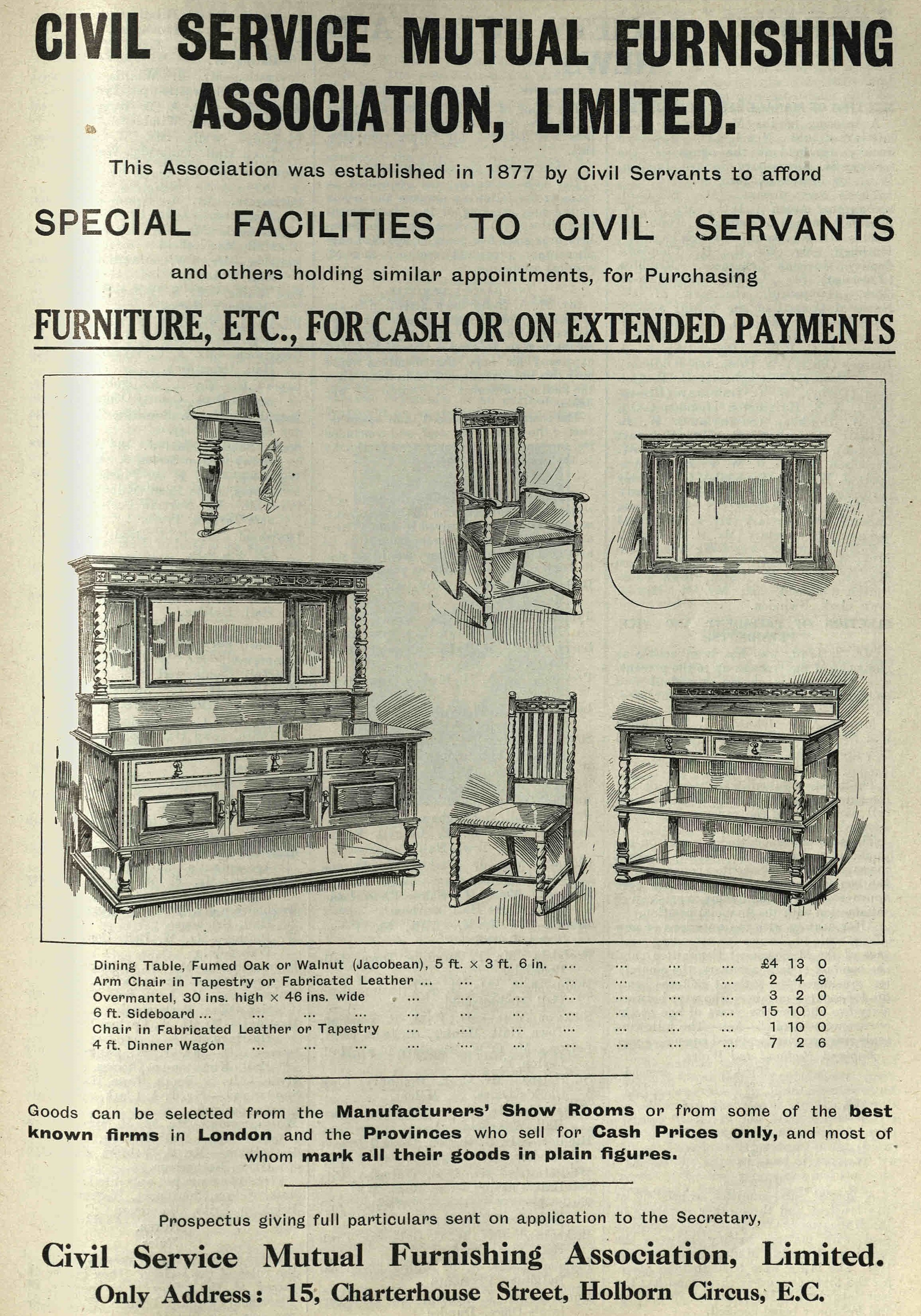 These adverts were published in trade union and labour movement journals between 1910-1929, and would have been targeted at a working class audience. They give general information about the costs of new items of furniture, including 'suites' to furnish particular rooms. Many of the adverts are for 'hire-purchase' companies such as Smart Bros. Ltd. and Downing's, both of Elephant and Castle, London. These firms allowed the purchaser to buy goods through a series of monthly payments rather than by paying the full sum in one go. The total cost of buying 'on the H.P.' would have been dearer than paying up front. Furniture could also have been purchased second-hand or passed on by family or friends.