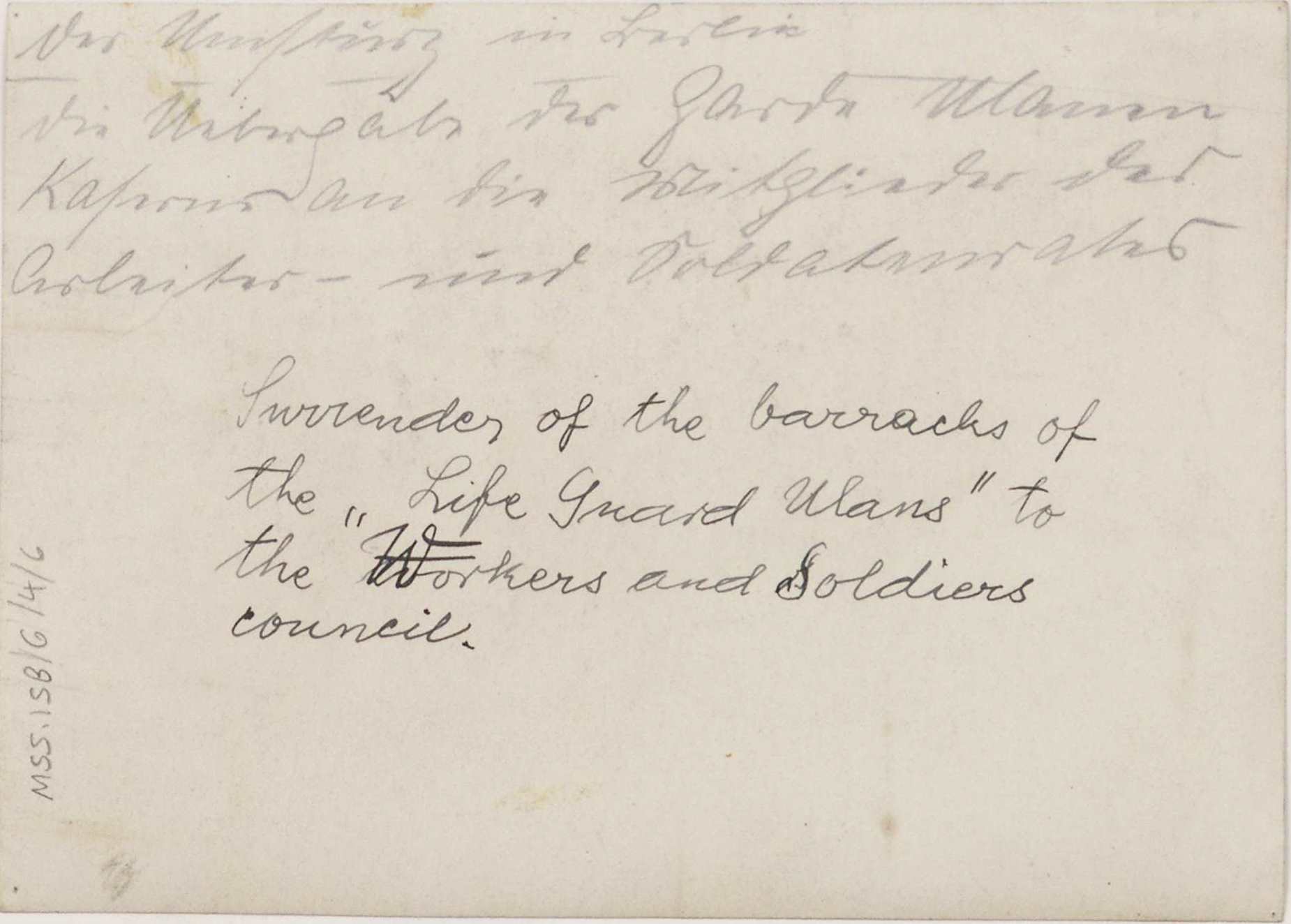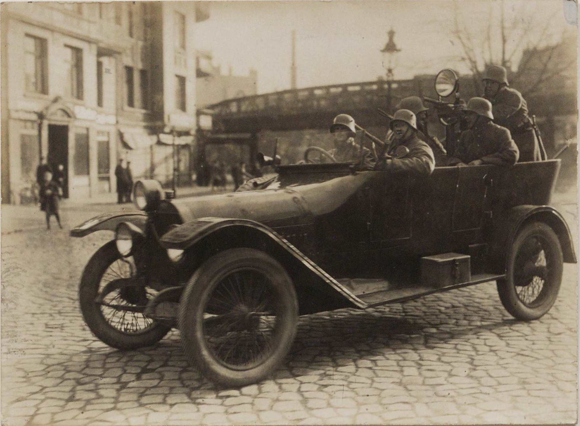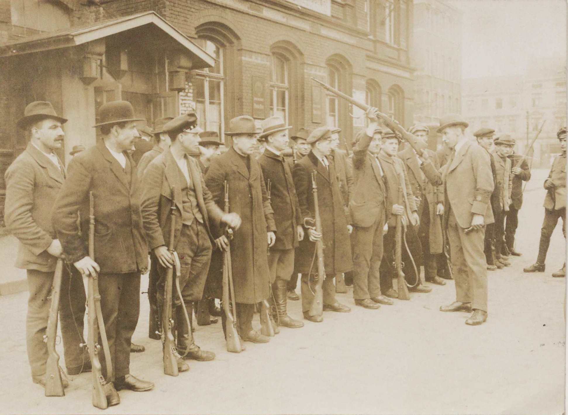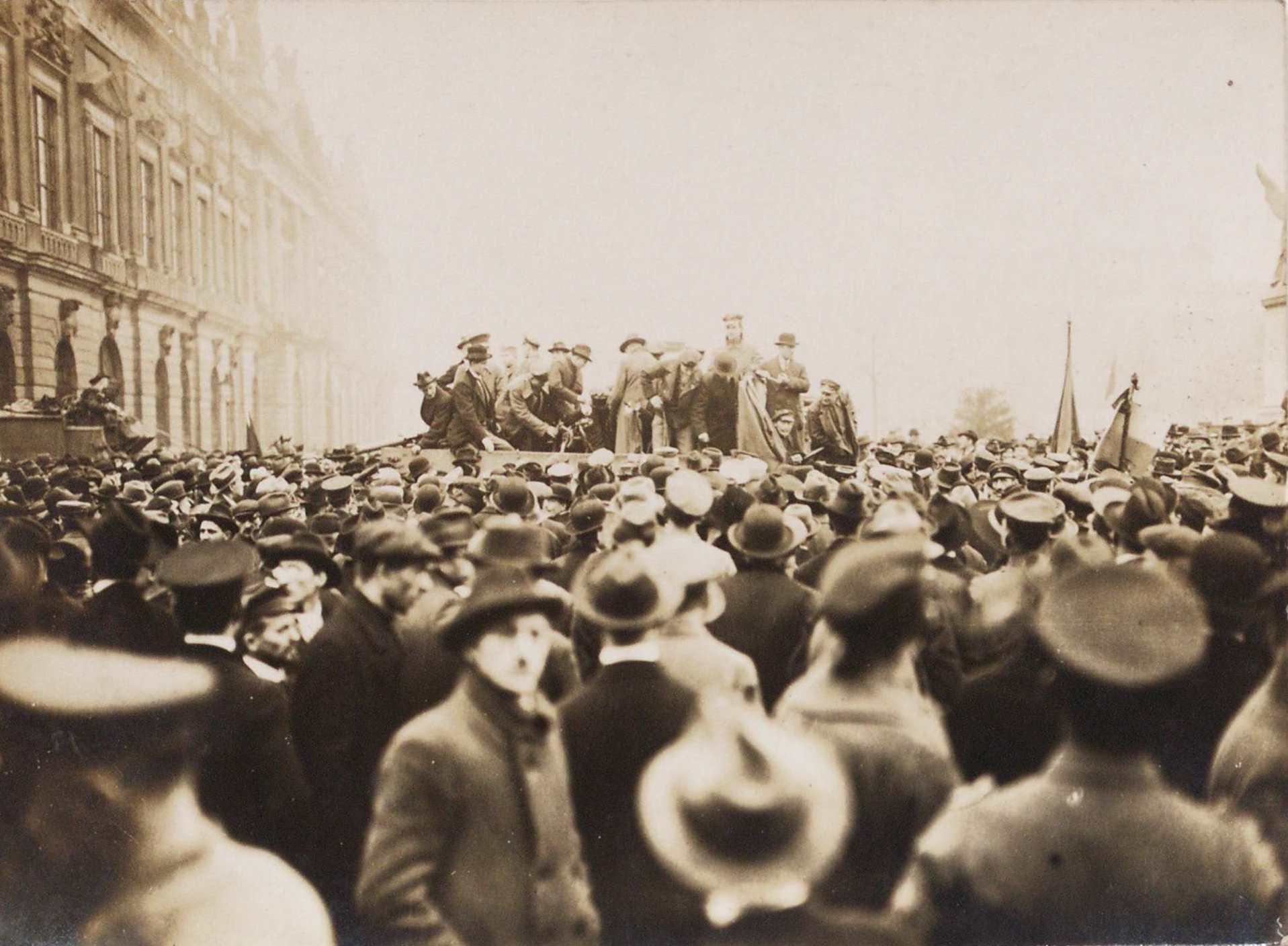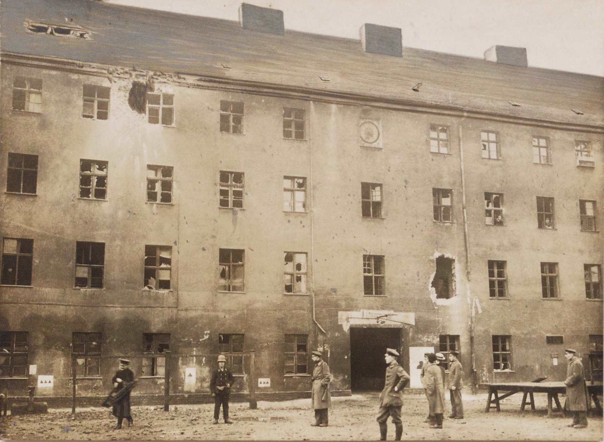They include a portrait of Karl Liebknecht and photographs of a Spartakusbund [Spartacus League] demonstration outside the Berlin army museum, 8 December 1918; the "Surrender of the barracks of the "Life Guard Ulans" to the Workers and Soldiers Council", undated; the "Barracks of the "Life Guard pioneers" in Berlin after the attack of revolutionary forces", 7 January 1919; damage to the Berlin office of the Social Democratic Party newspaper Vorwärts, 1919; the Red Army in Rhineland and Westphalia after the Kapp putsch, c1920; anti-fascist demonstrations in Berlin and Dresden, August and September 1923; "Hitlertruppen" [Hitler troops] in Bavaria, September 1923; two men being searched at army checkpoint, and a barricade across a road in Hamburg during October 1923; a wounded man being carried away after police had "intervened" with a demonstration of unemployed workers at Alexanderplatz in Berlin, October 1923; the army in Dresden, October 1923; a march (of workers?) - "Sachsische Hundertschaften", 1923; "Der "Deutsche Tag" in Halle": men (Communists?) looking over fence into courtyard, and General Ludendorff inspecting troops, 1924.