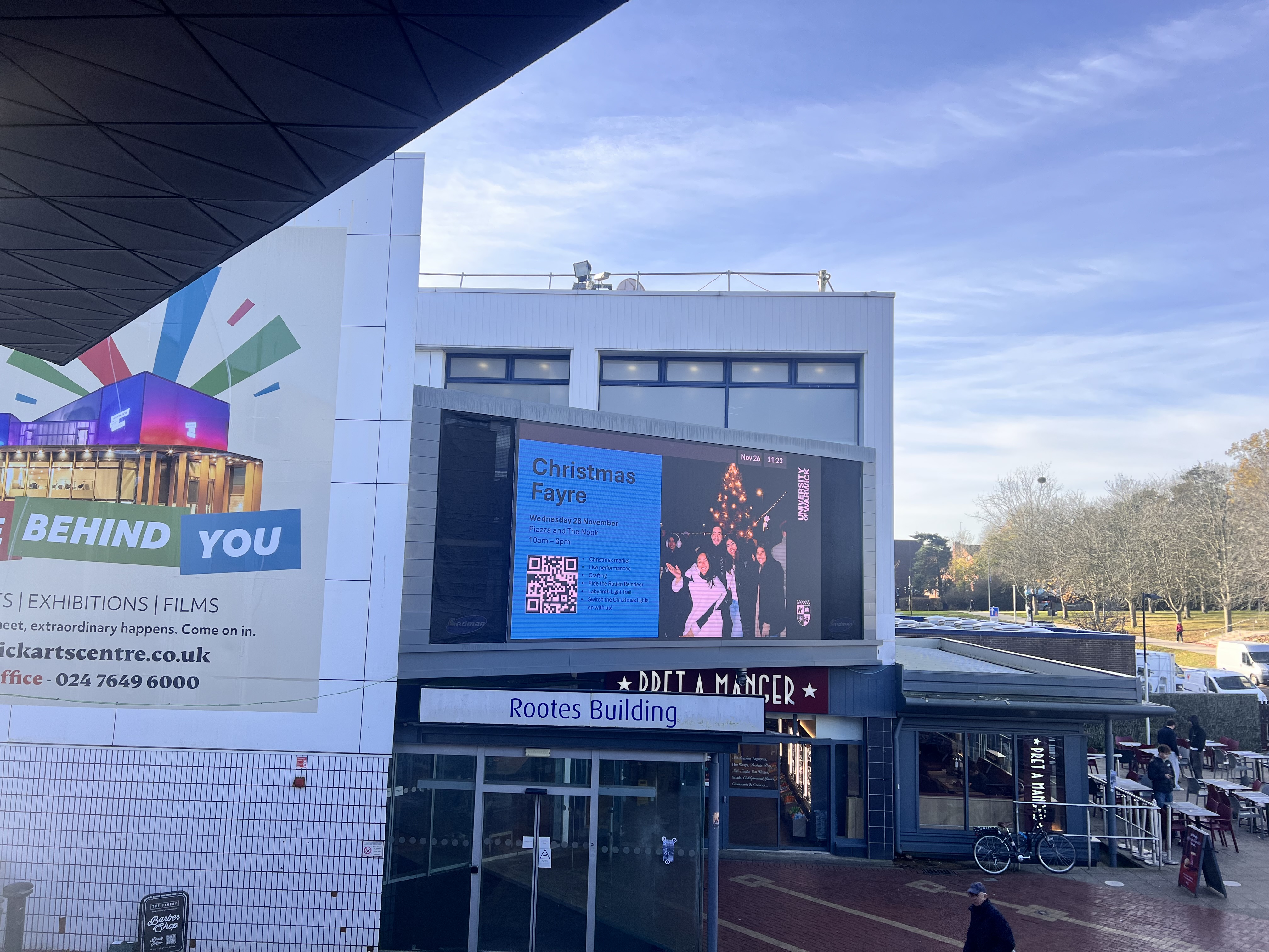 Each day, the Big Screen show a playlist of varying content. Sometimes the screen is taken over for specific events, such as open days, family days, graduation, sporting or cultural events and screenings.