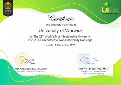 The University of Warwick was awarded 4th in the UK, ranking 29th of the 912 participating universities.