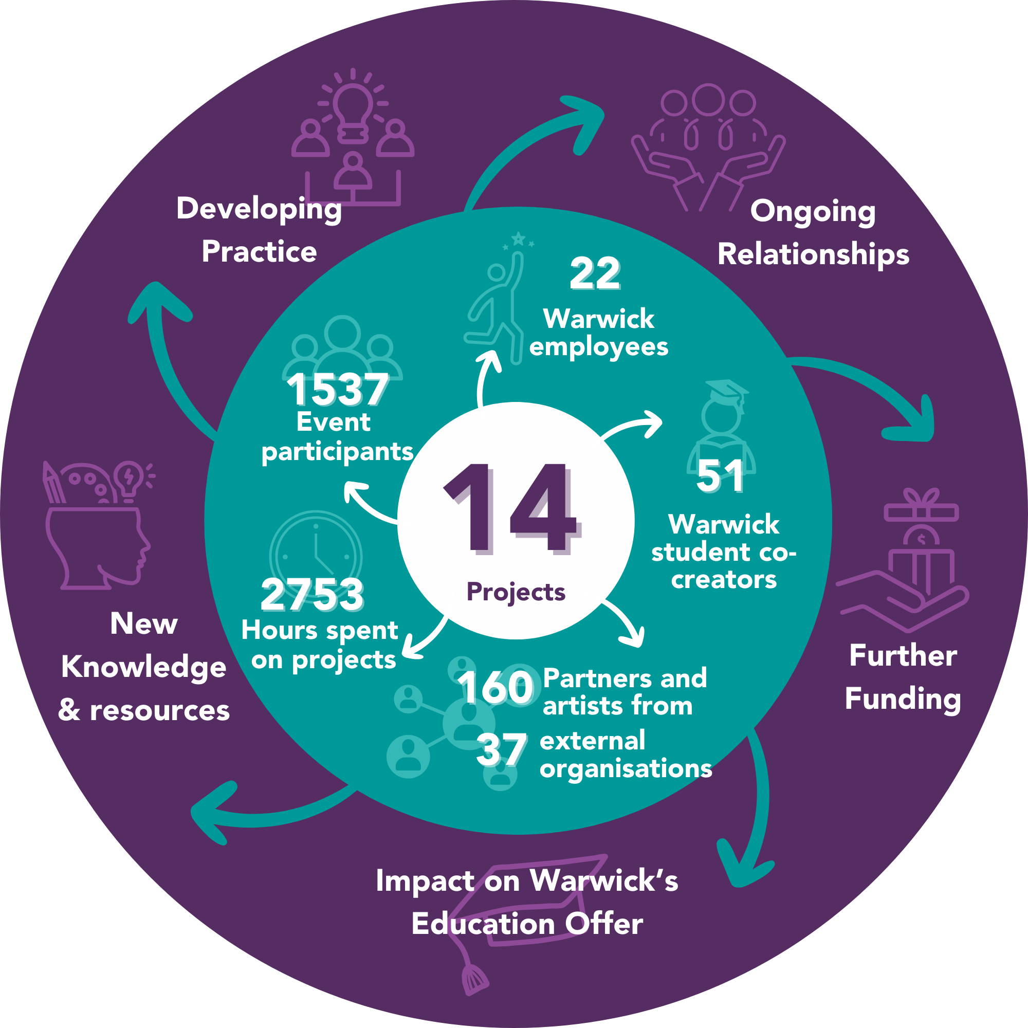 Since we launched the Collaboration and Co-Production Fund in 2021, we have seen some amazing success stories emerge. We have sought to summarise and celebrate the success of each cohort using the interactive graphics below. Click the arrow icons to explore the impact of our funded projects from 2021 - 2024 and view our most recently funded 2024 - 2025 projects. Each Project has an initial year of funding and we then track the ongoing impact over a period of 2 years, therefore the the data below is cumulative, and refreshed yearly until the projects reach the end of the 3rd year from initial funding.